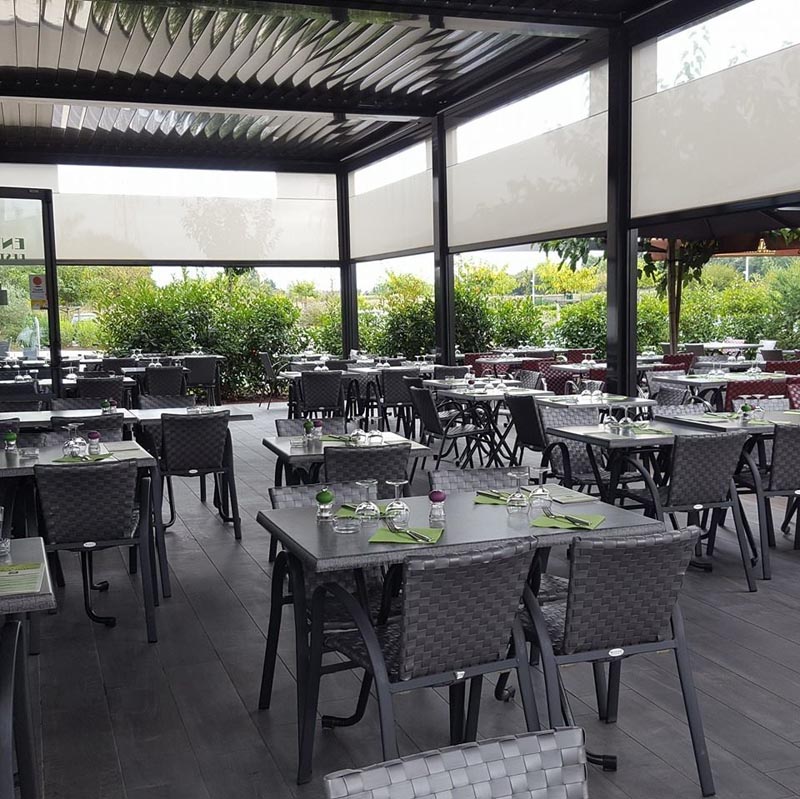 En saison ensoleillée, le plaisir de déjeuner en terrasse ombragée vous est proposé avec un équipement de 140 couverts.