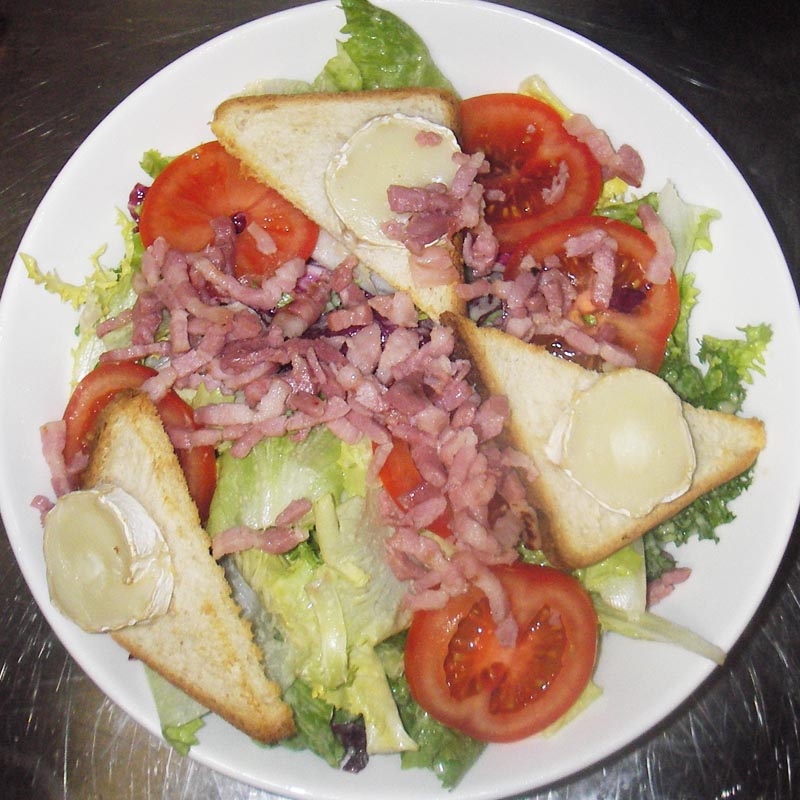 (Salade, Chèvre fondu sur toasts, lardons, tomates)